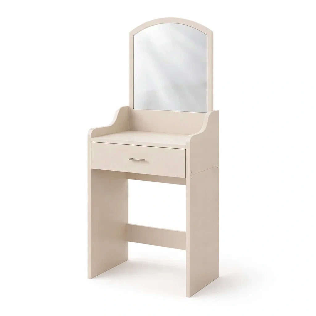 Dieser Frisiertisch besteht aus einem Holzwerkstoff mit Melaminbeschichtung und einem Spiegel aus 4 mm Klarglas. Die Maße sind 80 cm Breite, 40 cm Tiefe und 140 cm Höhe. Die beige Farbe verleiht ihm ein harmonisches Aussehen. Der Tisch verfügt zudem über eine Schublade mit einem Metallgriff.